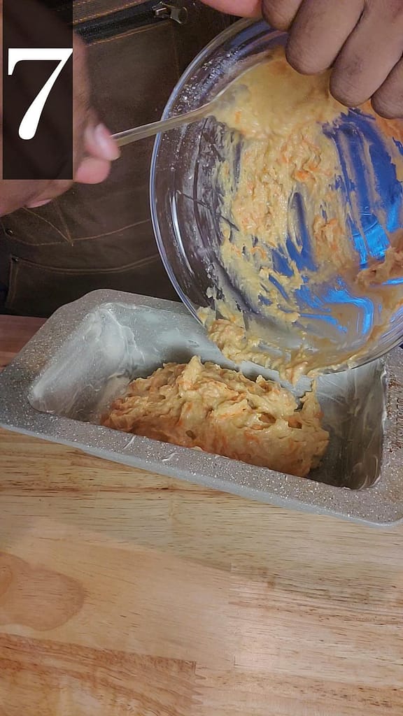 5. Pour into prepared loaf pan, and spread evenly with spoon. Batter will be thick.