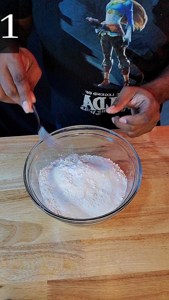 - Add wet mixture to dry mixture. Mix by hand. Do not over mix. We are not trying to develop gluten. Dough should still have streaks of flour.