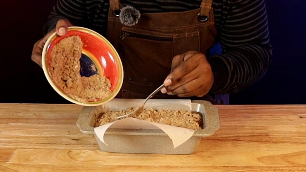 - Add the batter to your prepared loaf pan. Sprinkle with the streusel topping.