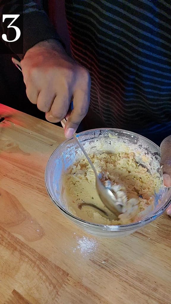 3. Add flour. Beat by hand until a thick dough forms. Add dough to pastry bag and piping tip into desired shapes.