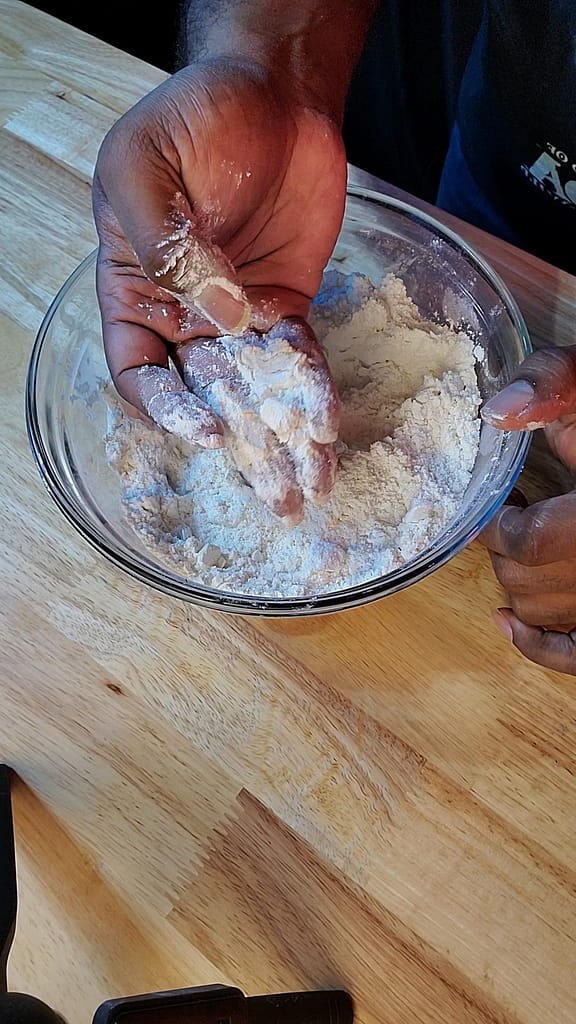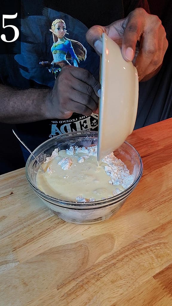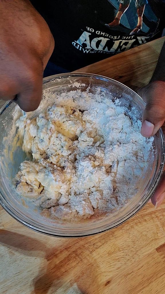 - Add wet mixture to dry mixture. Mix by hand. Do not over mix. We are not trying to develop gluten. Dough should still have streaks of flour.