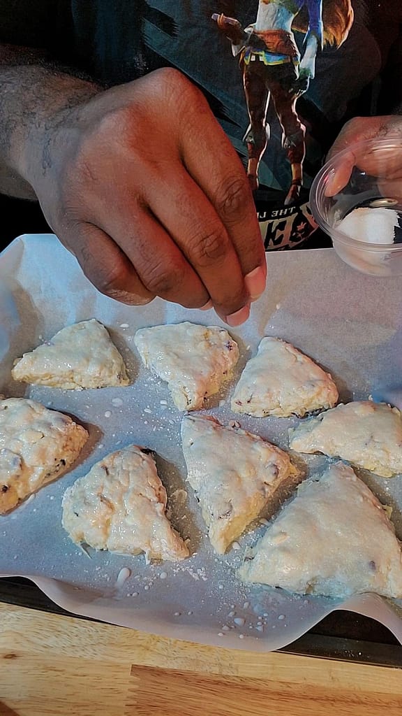 - Place on a parchment lined cookie sheet. Brush the tops with a little more cream and sprinkle with sugar (decorative or granulated).