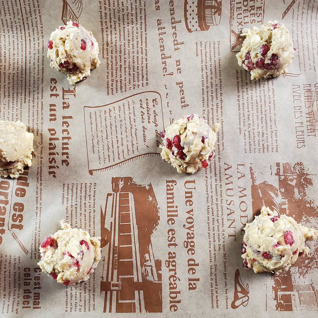 - Add in the pomegranate arils. Being very very gentle and by hand, mix in the arils being careful not to bruise them as they will turn batter pink if you are too rough. If you don’t feel comfortable stirring them into the batter, you can also form balls of dough in your hands and press 5-7 arils into each cookie by hand.