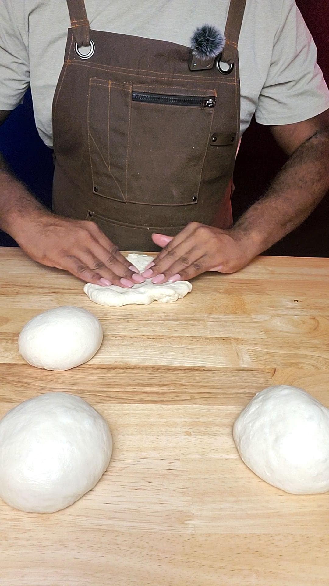 - Once dough is proofed, punch dough down. Get your kitchen scale and weigh dough. Cut dough into 6 equal pieces by weight. Roll pieces into balls. Cover and let rest on bench for about 15 minutes.