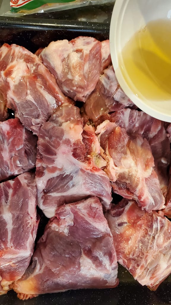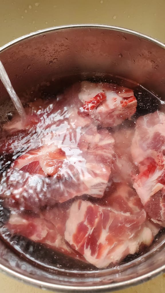 1. In a large bowl, add your raw pork neckbones. Rinse them in cold water. Rub and massage them to wash away blood or any bone dust.