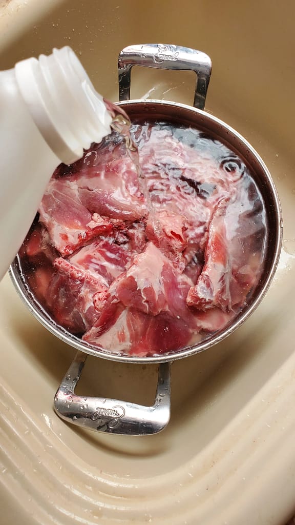 2. Pour the water off and fill the bowl with fresh water. Add white distilled white vinegar. Set aside to soak for at least 20mins. (This will allow any remaining blood to be pulled out)