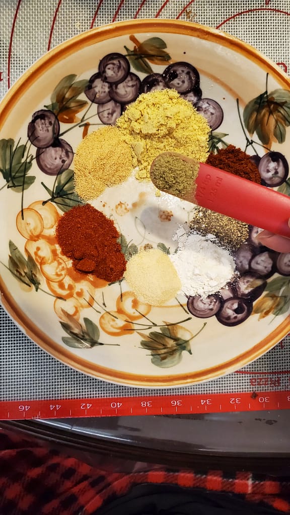3. To a small bowl, add the chipotle chili powder, onion powder, garlic powder, black pepper, Lawry’s seasoning salt, knorr chicken bouillon, paprika, light brown sugar (I use organic), and ground sage. Mix until well combined. Set aside.