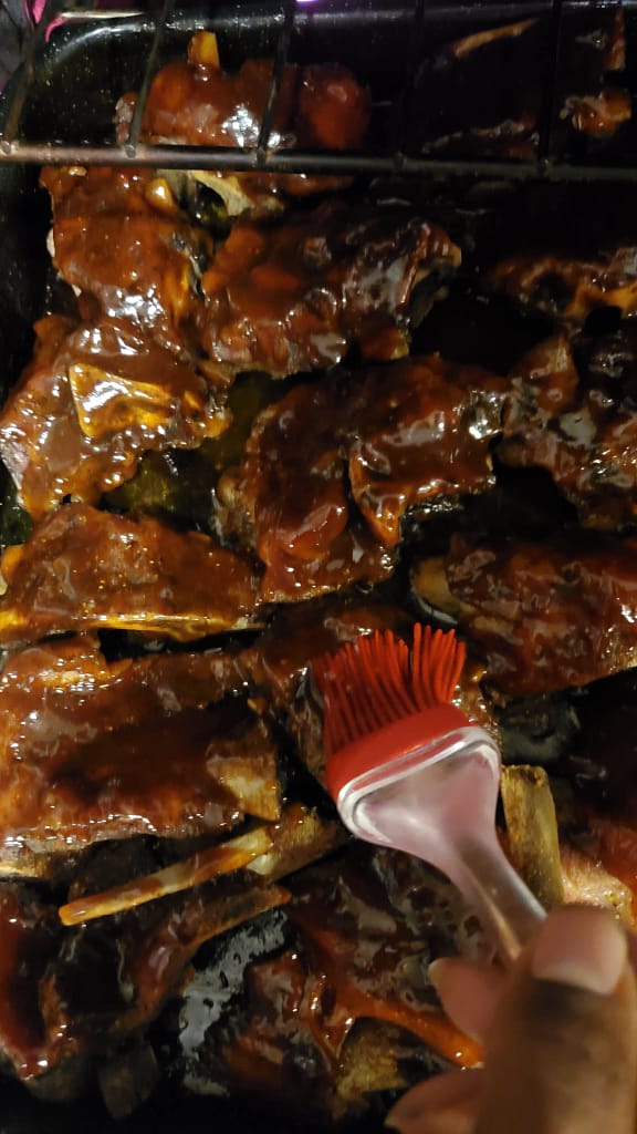 8. Once neckbones are tender, uncover and brush with barbecue sauce. Back uncovered for another 15-20 mins, or until sauce is sticky