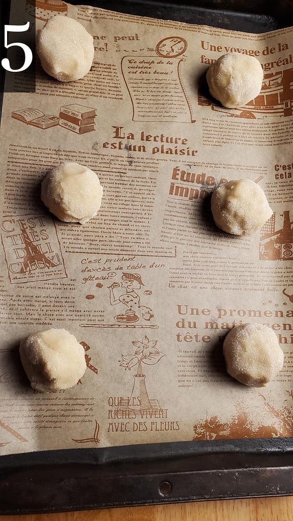 5. Line a cookie sheet with parchment paper. Scoop cookies 3 to 4 tbsps at a time. We want big cookies. Roll the dough balls in the dusting sugar and place them on the cookie sheet.